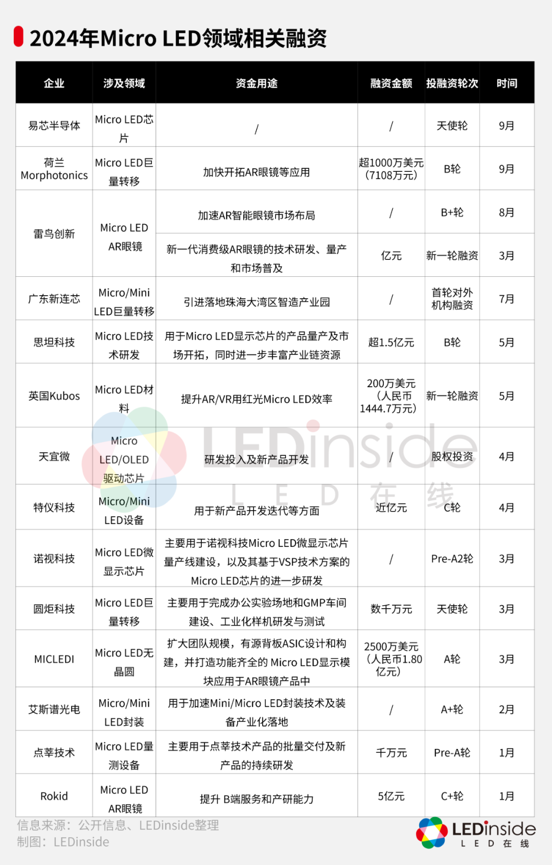 据LEDinside不完全统计,今年以来已有15家Micro LED相关企业在获得了新一轮的投融资资金。这些资金将分别用于Micro LED芯片的研发、Micro LED封装产品及其模组的研发、Micro LED设备的制造以及消费级AR眼镜的开发等方面。