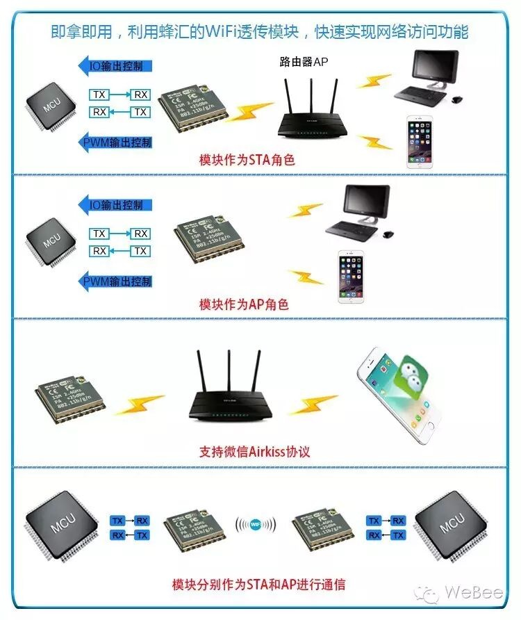 W-004 WiFi模块集成了串口透传,支持SmartConfig、IO口控制、AD采集等功能,支持Airkiss协议,即拿即用, 用户通过串口即可使用网络访问的功能。