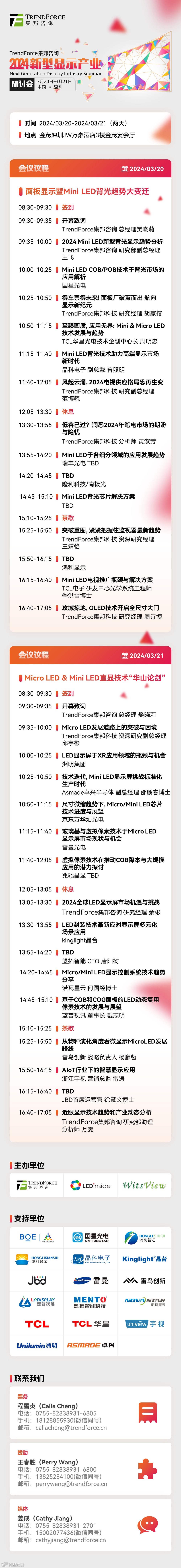 解读面板显示暨Mini LED背光趋势大变迁,论剑Micro LED & Mini LED直显技术,2024集邦咨询新型显示产业研讨会3月20-21日深圳见。即刻免费报名👇👇👇