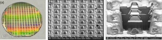图1:(a)单片全彩晶圆;(b)5um彩色像素间距阵列;(c)横截面图像展示了垂直堆叠和多级互连技术。