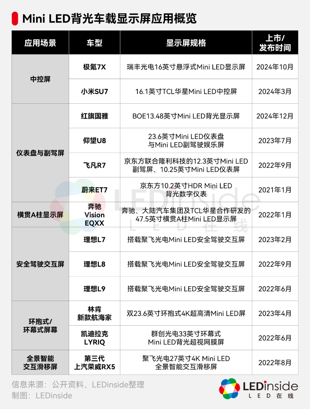 其中,Mini LED技术因其高亮度、高对比度和高色域等优势,已被多家国内外车企应用于量产车型。国内品牌如红旗、极氪、小米、仰望、飞凡、蔚来、理想、上汽荣威等已率先采用。国外品牌如奔驰、林肯、凯迪拉克等也引入此技术,提升高端车型的显示效果。