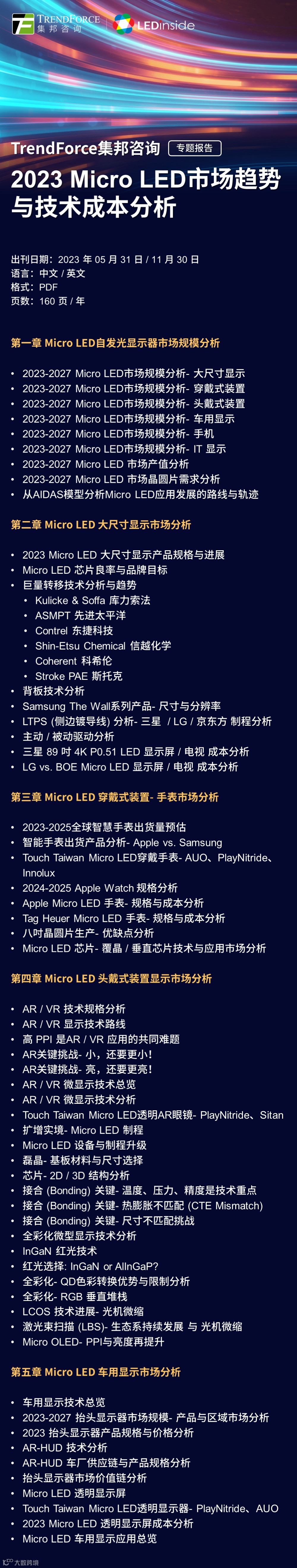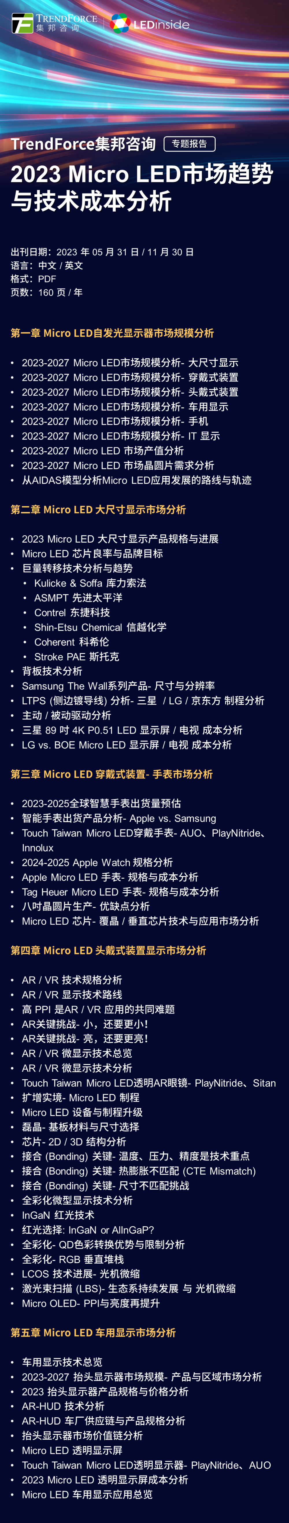 更多Micro LED显示深入行情,欢迎了解TrendForce集邦咨询最新出刊的《2023 Micro LED市场趋势与技术成本分析报告》。