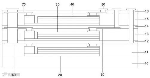 摘要显示,本发明提供一种Micro LED器件及其制备方法,该Micro LED器件包括衬底及依次设于衬底上的芯片封装层及重布线层,芯片封装层内交错层叠设置有若干个发光芯片,芯片封装层与衬底之间设有黏附层,芯片封装层与重布线层之间设有绝缘层,Micro LED器件还包括连接重布线层与发光芯片的金属连接层。通过在芯片封装层内交错层叠设置若干个发光芯片,即将原本处于同一平面的多个芯片分成了若干份,进而降低平面巨量转移的难度,通过分批次分层对芯片进行封装,相当于加大了每层芯片之间的设计间距,即消除了平面上已转移芯片对后续待转移芯片的影响,降低了转移难度,提高加工效率及良率。