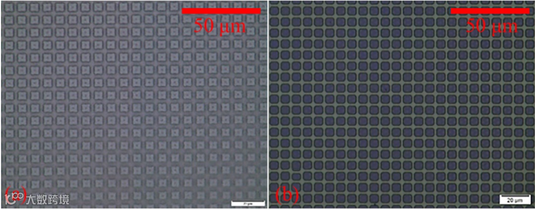 台面刻蚀是定义发光单元的关键步骤,直接决定了最终芯片的发光区域。文章发现在大数量级下小尺寸的台面刻蚀出现了移位甚至缺失的现象,如图4(a)。