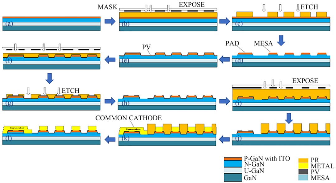 第一步,如图2中的(a)到(d)所示,利用磁控溅射在晶圆上沉积75 nm的ITO后进行退火处理以提高其电流扩展能力。随后采用正性光刻胶作为刻蚀掩膜,利用单次ICP刻蚀完成ITO图案化和台面刻蚀,刻蚀深度至N型氮化镓层,但不刻透,这样一来可以使得所有台面通过N型氮化镓形成共阴极结构。