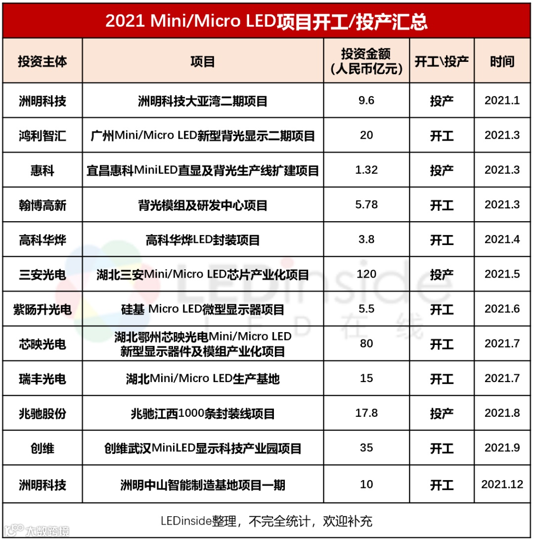 回顾2021,在LED全行业面临供应链缺货和成本增加等一系列问题之际,Mini/Micro LED的投资发展却并未停止。