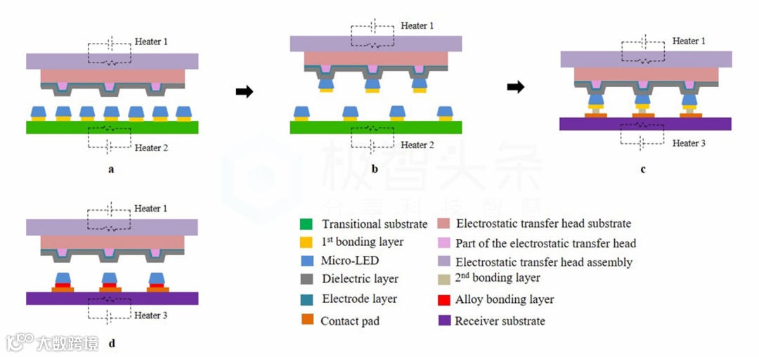 静电吸附是利用静电转移头产生吸引力或者排斥力实现对micro-LED的拾取和放置。(图3.6,引用Apple的专利。)在拾取micro-LED阶段,在吸附转移头和芯片上产生不同电荷,将micro-LED吸附拾取。在放置micro-LED阶段,通过调节内外电极电压差,使得电压差为零,将micro-LED放置到接收衬底。键合方式包括共晶合金键合、瞬态液相键合或固态扩散键合。