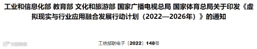 11月1日,工业和信息化部、教育部、文化和旅游部、国家广播电视总局、国家体育总局印发《虚拟现实与行业应用融合发展行动计划(2022-2026年)》。