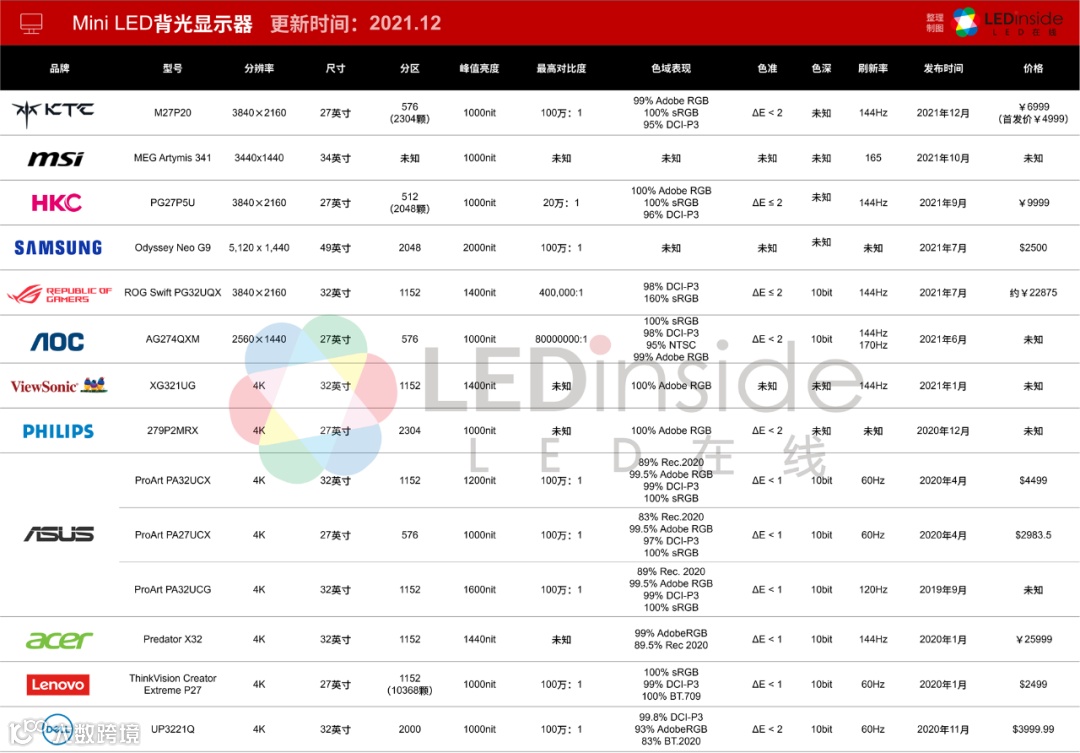 有趣的是,雷神这款显示器与12月初KTC(康冠科技)推出的一款Mini LED背光显示器参数基本一致,就连面板供应商(友达)和首发价格(¥4999)都分毫不差。这也意味着,这两款显示器或许同为当前价格最低的Mini LED背光显示器。