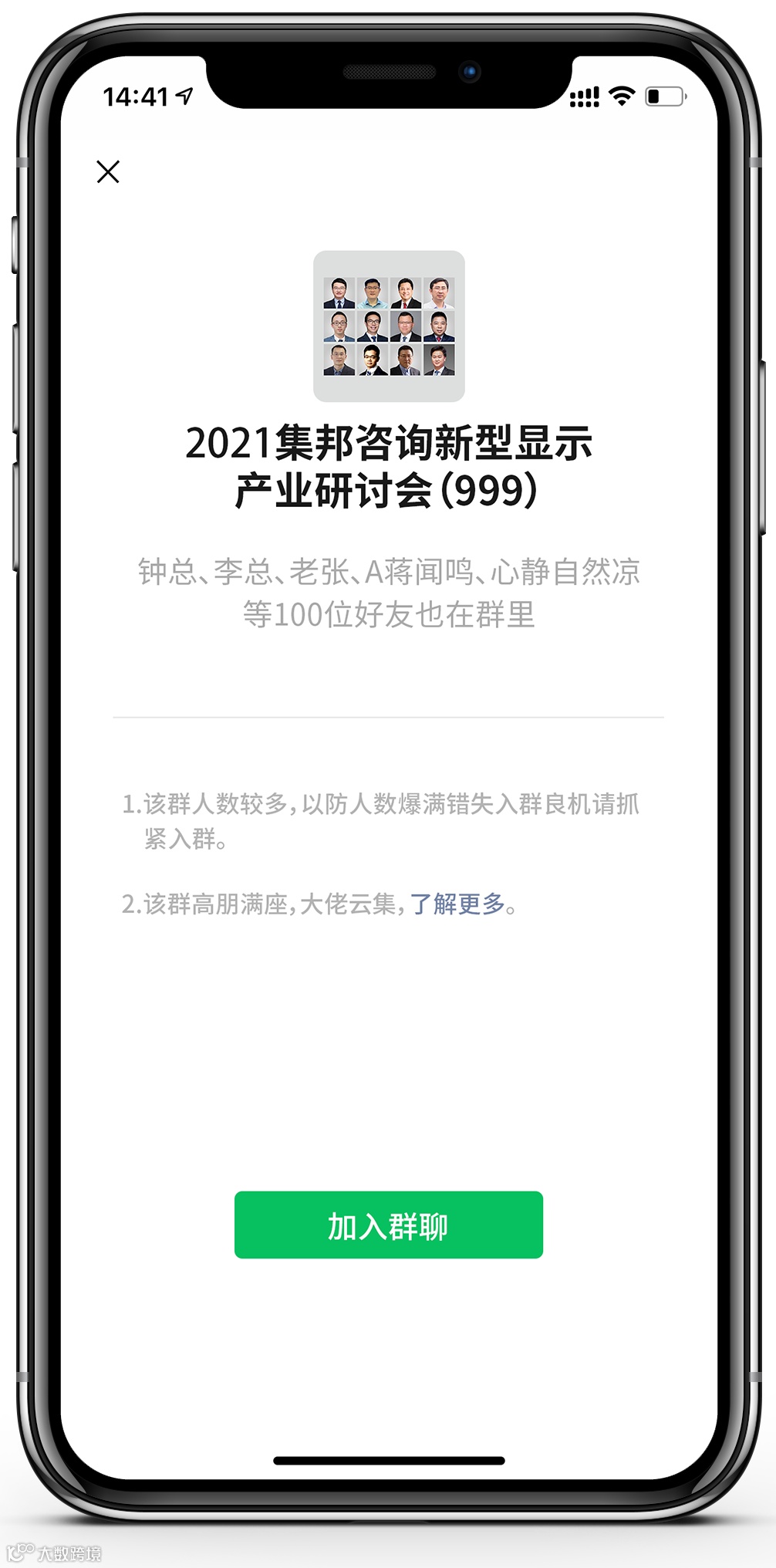 群主邀请你和、集邦科技 林启东、集邦咨询 王飞、国星光电 叶云、雷曼光电 李漫铁、晶能光电 梁伏波、宇视科技 雷涛、诺瓦科技 何国经、AIXTRON 方子文、蓝普视讯 戴志明、晶台股份 邵鹏睿、康佳集团 林伟瀚、华灿光电 李鹏、集邦咨询 余彬、鸿利显示 陈永铭、叶国光、瑞丰光电 裴小明、海信 林昌廷、TCL 季洪雷、艾比森 石昌金等1000人加入了群聊
