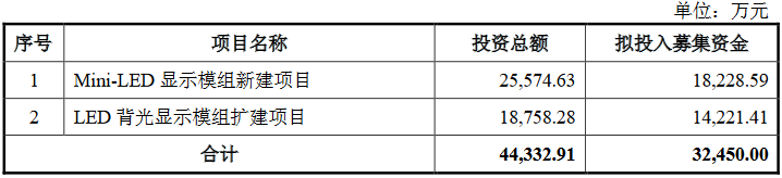 本次发行可转债募集资金超过人民币32,450.00万元,将用于“Mini-LED显示模组新建项目”和“LED背光显示模组扩建项目”。两个项目的实施都将有助于隆利科技扩大公司产能和规模。