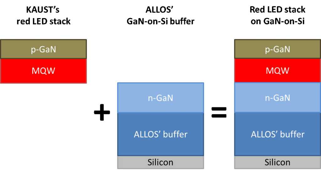 KAUST团队与ALLOS将充分利用各自的专业知识来处理应变问题,优化硅基氮化镓和红色LED的晶体生长条件,进而实现在硅基氮化镓缓冲层上生长红色LED堆栈(Stack)。