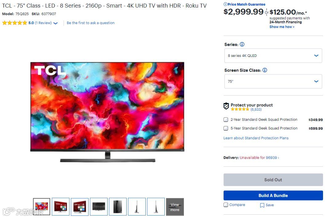 搭载Mini LED背光的TCL 8系电视近日上架美国消费电子零售商Best Buy(百思买)网站。网站价格显示,65英寸的产品售价为1,999.99美元(约合人民币14,176元),75英寸售价则为2,999.99美元(约合人民币21,265元)。