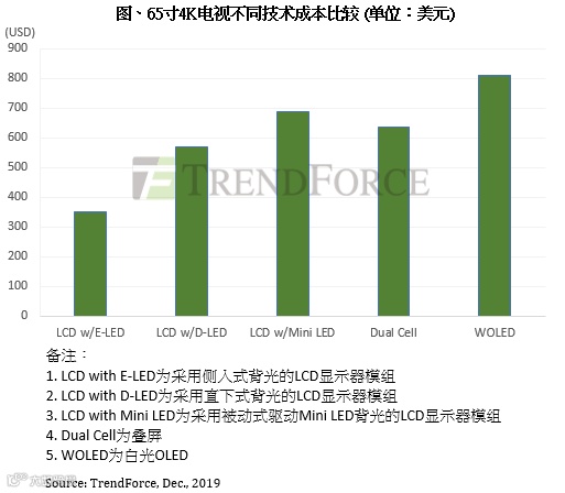 65寸UHD 4K电视在不同技术的成本表现上,高端的侧入式背光显示器模组生产成本约在350美元;而采用被动式驱动的Mini LED背光(LED使用颗数16,000颗)的显示器模组则约在650~690美元之间;至于海信今年所发布的叠屏电视(Dual Cell),推算其显示器模组的成本约在630美元左右。虽然Mini LED电视的生产成本还是略高,但已开始具备市场竞争力。
