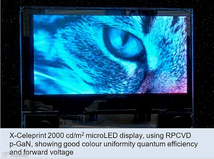 该公司表示,采用BluGlass的远程等离子化学气相沉积p-GaN技术,X-Celeprint的主动矩阵式Micro LED显示屏亮度优异,包括色彩均匀度、量子效率和正向电压等特性,可相当于目前高性能商业应用显示屏2000nits的亮度。