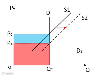 简单的用图形来描述的话,就是当供给方因为产能的增加,或者技术的进步,或者成本下降,或者其他的原因,带来的结果是供给能力的提升,即供给曲线由S1移向了S2。但是,由于购买者的需求价格弹性很小,以至于供给的增加完全表现为价格的下降,而没有带来销售量的增长。