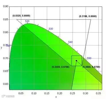 ▲ 图5:满足DCI色域(含误差)要求的LED绿光色坐标范围