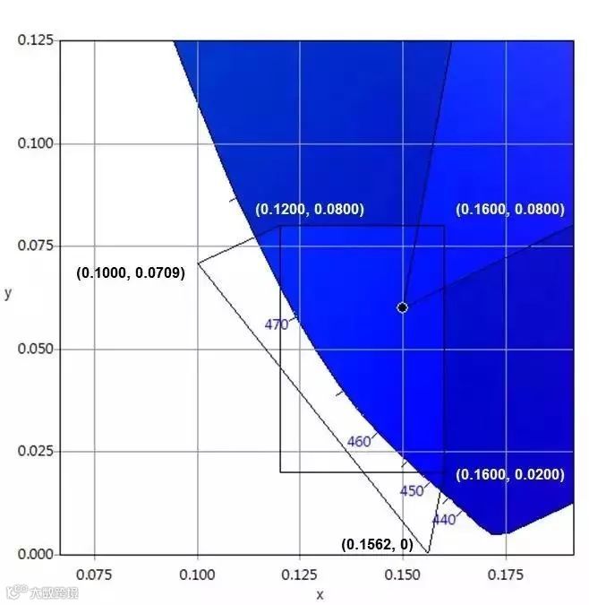 ▲ 图6:满足DCI色域(含误差)要求的LED蓝光色坐标范围