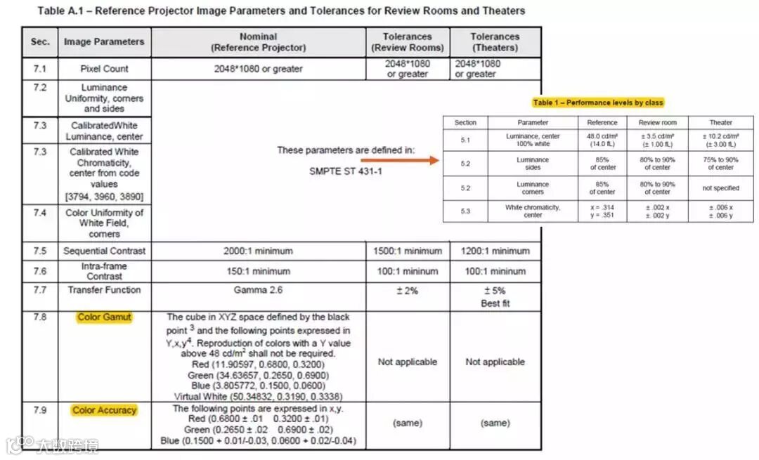 DCI对于显示图像的要求可以参考一下表1。屏幕分辨率要求2K (2048 x 1080)或者4K(4096 x 2160),亮度要求48 ± 10.2 cd/m2,对比度要求至少1200:1(测试条件为影院环境光,屏面反光小于0.03cd/m2),白平衡点已经色域要求如图1所示,同时允许一定的误差。标准R, G, B三基色对应的饱和度主波长分别是100% 621nm、89.5% 544nm、92.9% 465nm。