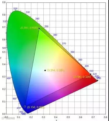 第二,图示区域范围已经把DCI规定允许的颜色误差都考虑进去了。而实际LED显示屏上的颜色误差除了LED本身外,还有芯片输出驱动电流的误差,屏体不同区域的温度误差,校正系统的误差,以及色点测试仪器的误差等。所以LED供应商定义的色点范围应当尽量小于图示边界区域,为显示屏体设计和后续测试的误差留有余量。