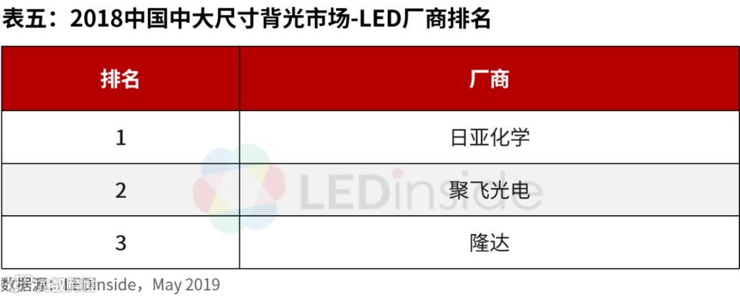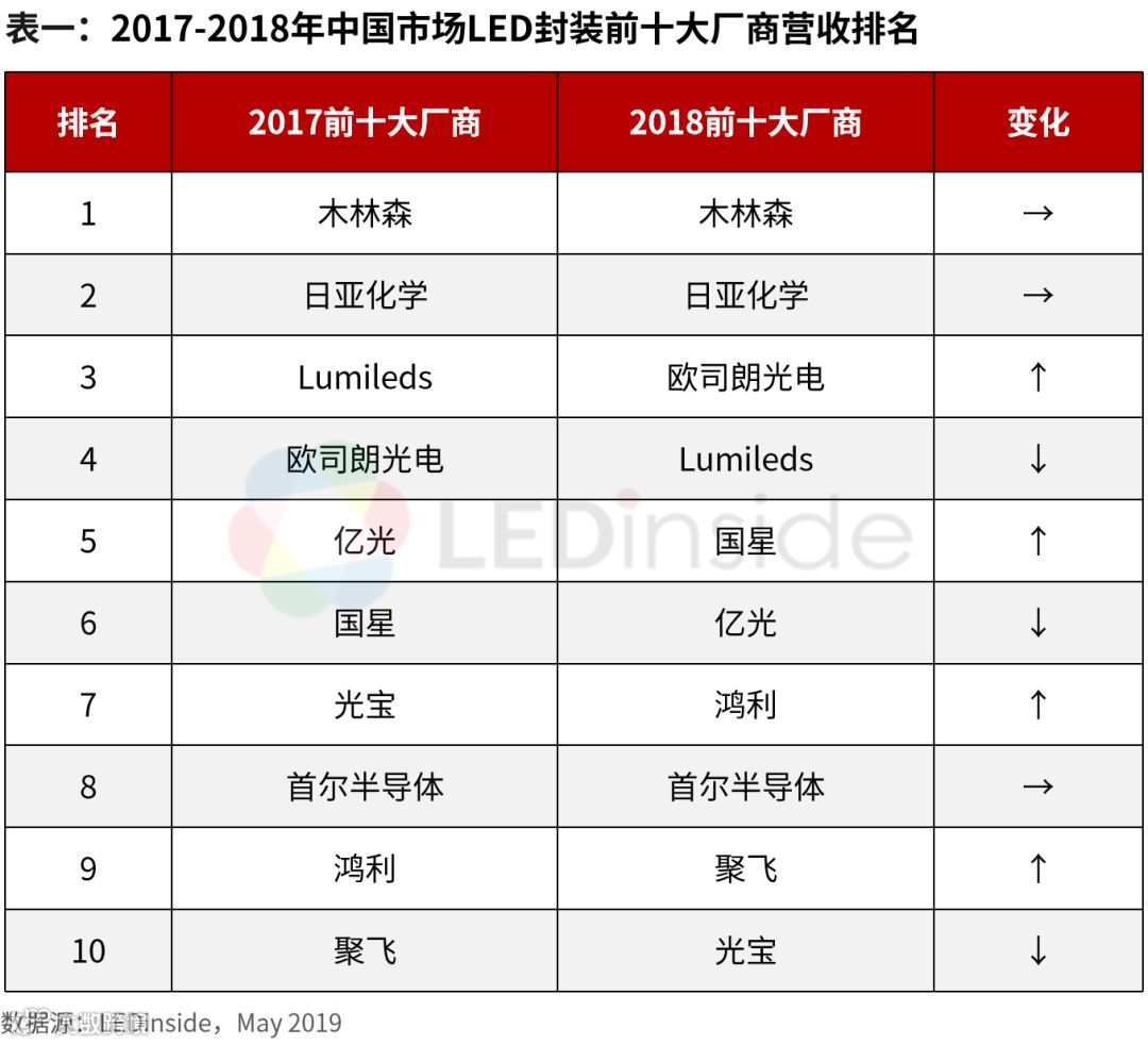 整体来看中国LED产业发展,中国大陆厂商受惠于产能与代工订单,2018年排名均有所提升,木林森、国星、聚飞、鸿利营业收入继续增长。国际厂商日亚化学凭借背光、车用及照明等高端应用市场的技术专利优势,保持第二;欧司朗光电半导体 (OSRAM OS) 则凭借汽车照明、景观亮化等市场的优势,排名上升一位至第三。中国台湾地区及国际厂商在高端领域依然表现出强大的竞争力。前十大厂商市占率为47%,与2017年相比微幅下滑。主要原因为东山精密和天电光电等新秀厂商高速追赶,且2018年营收均有不错的成长,未来两年内有望冲击前十。