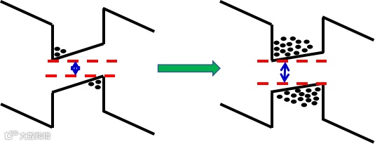 峰移主要是由c面氮化镓材料中固有的极化场导致的:它使得量子阱的能带倾斜,因此随着电流(电子、空穴)的增加,能带会被拉平,导致能隙变宽,从而引起发光光子能量的增加及波峰的移动。