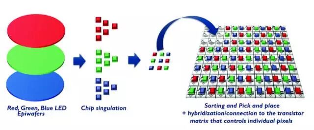 ♦ MicroLED显示器是通过将晶片切割成微小器件,并以并行拾取和放置技术将其转移到晶体管底板