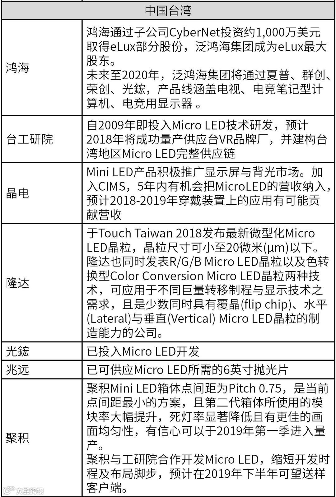 与陆系厂商相比,台系厂商稍快抢进Micro LED生产研究,台工研院于2009年便率先投入Micro LED开发,正从累积相当的制程技术与经验中,建立一条Micro LED试产线,最快今年第3季就将有产品可以交给VR厂商,在Micro LED的制造上,台工研院有望拔得头筹。其他重要企业如晶电、友达、群创、錼创、聚积等大厂也都积极地投入Micro LED相关技术的开发。