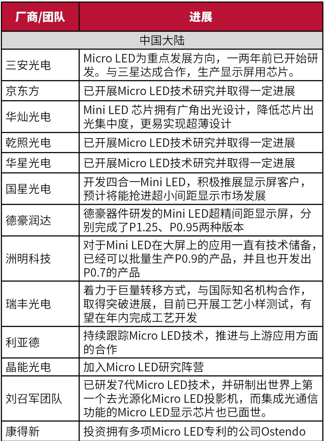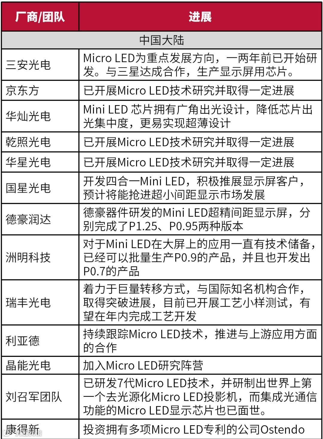 陆系LED芯片龙头三安光电曾于全景路演天下互动中表示,将Micro LED视为未来的重点发展方向,公司于一两年前已开始研发。中国最大的显示器制造商京东方也表示,目前公司已开展Micro LED的技术研究,并取得一定进展。