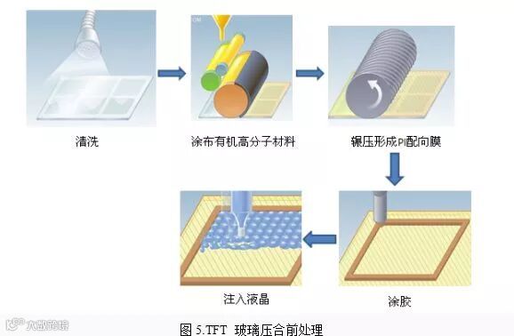 TFT-LCD 架构就如三明治,下层TFT玻璃与上层彩色滤光片中间夹着液晶。而TFT-LCD open cell中段制程也分为四个主要步骤: