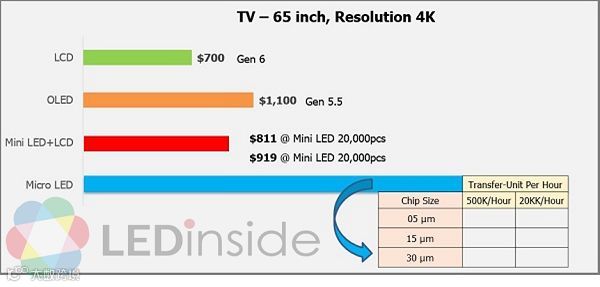 Micro LED TV的成本相较于传统的液晶电视与OLED TV短期内仍难以竞争。除非在65吋以上的电视领域,Micro LED TV才有切入的机会。