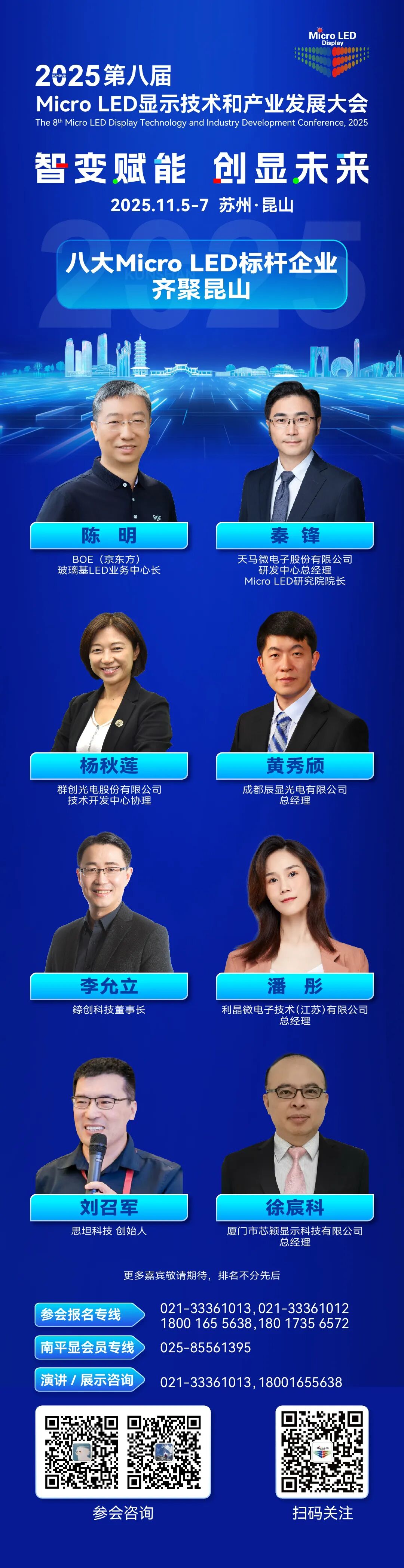 作为 Micro LED 显示领域年度核心盛会,2025第八届Micro LED显示技术和产业发展大会将于2025年11月5日至7日在苏州昆山举行。本次论坛以“智变赋能 创显未来”为主题,聚焦量产化关键技术攻坚、终端应用场景创新、产业生态协同共生三大方向,搭建“产学研投用”一体化对接平台,共同探讨Micro LED关键技术突破,洞悉市场发展趋势和终端应用场景,助力产业高质量发展。
