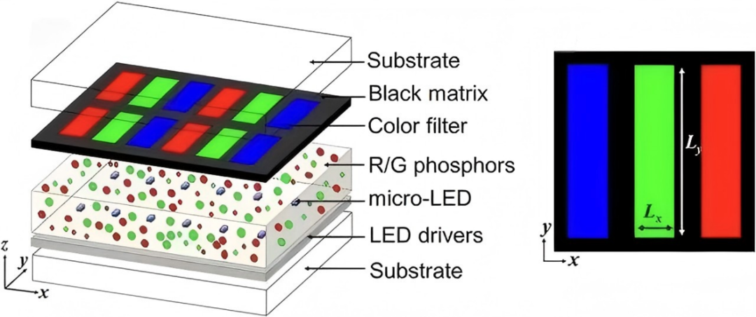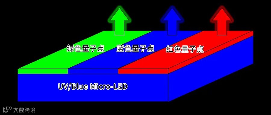 UV/Blue Micro-LED激发色转材料法原理与上述伪RGB混色法类似,只是仅采用UV或BLUE一种为单色基础光源,再以量子点或荧光粉(由于荧光粉颗粒较大,目前多采用量子点)等色转换材料为发光介质,实现全彩显示。