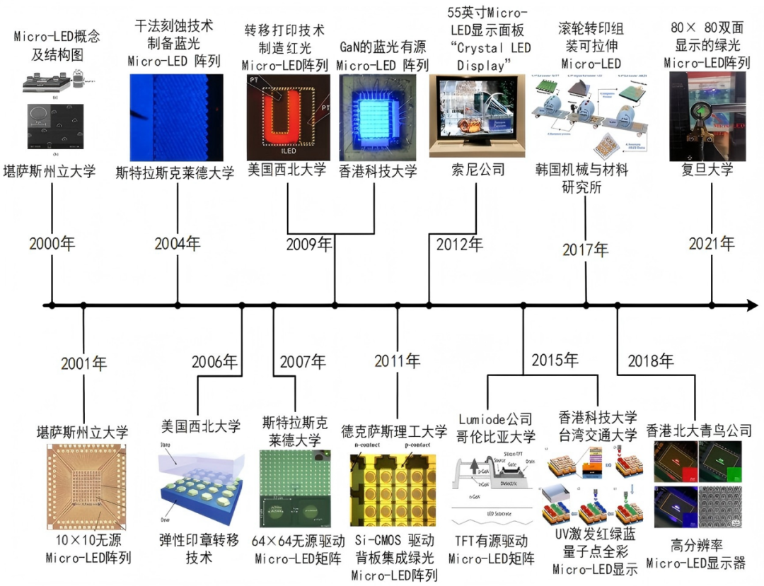 2000年,美国堪萨斯州立大学江红星等人制备了基于Ⅲ族氮化物的Micro-LED,并于2001年报道了采用无源驱动的方式,成功制备了10×10的蓝光Micro-LED阵列,为Micro-LED显示的发展奠定了理论基础。2012年,索尼就发布了基于Micro-LED的55寸高清LED电视样品,这是Micro-LED作为商业化产品第一次出现在大众视野。2016年6月,索尼在InfoCommn展示了将P1.26 Micro-LED元件作为像素使用的CLEDIS显示屏,其出色的显示效果受到业界高度褒奖,开启了Micro-LED的研究热潮。2016年后,Micro-LED处于高速发展阶段,由于Micro-LED显示技术横跨多个产业领域,加之未来在微型显示、显示面板等应用想象空间非常广,吸引了不少业者投入研发。从Micro-LED概念首次提出,到近几年已经成为国际竞争关键科技焦点之一,目前,我国也在“十四五”规划中大力投入对Micro-LED技术的研究。