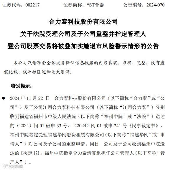 11月25日消息,昨(24日)*ST合泰发布2则关于股市叠加风险警示和重整公告。