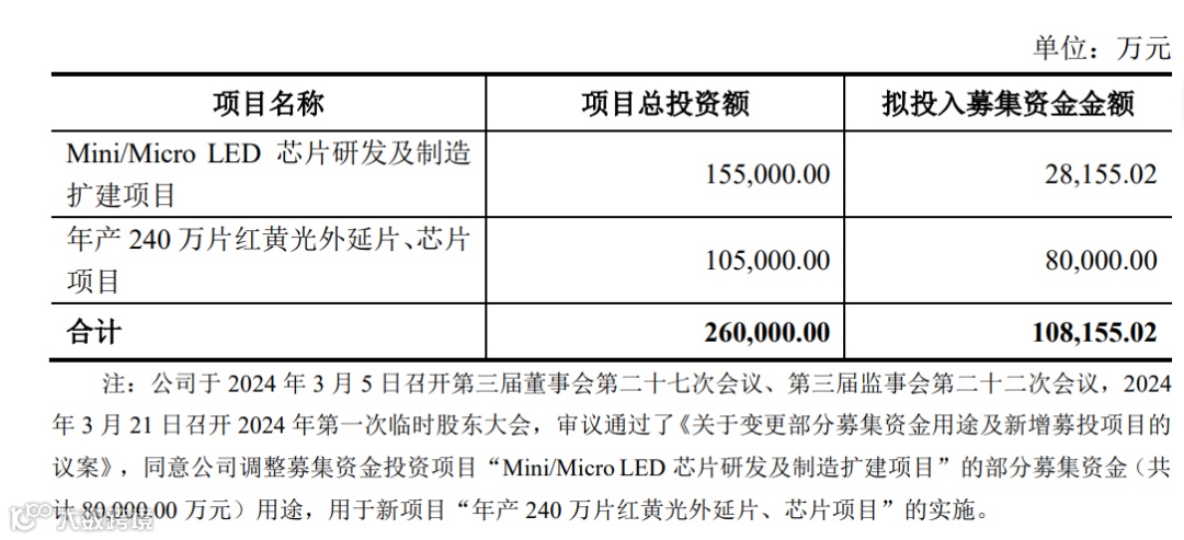今年3月5日晚,聚灿光电发布“关于变更部分募集资金用途及新增募投项目的公告”称,公司“Mini/Micro LED芯片研发及制造扩建项目”原计划募集资金投入约10.82亿元,截至2023年12月31日,投入募集资金65.11万元,剩余募集资金约10.81亿元,为提高募集资金使用效率,公司拟变更“Mini/Micro LED芯片研发及制造扩建项目”的部分募集资金(共计8亿元)用途,用于新项目“年产240万片红黄光外延片、芯片项目”的实施。