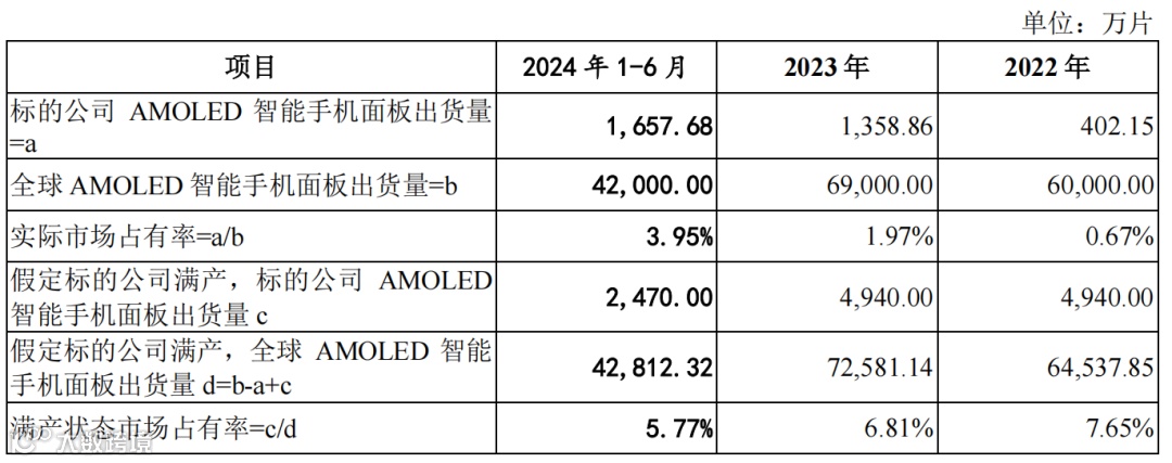 由于标的公司成立时间较短,暂无其市场占有率的第三方数据统计。根据公开数据,计算标的资产在 AMOLED 智能手机面板市场的占有率,具体计算过程如下表所示。