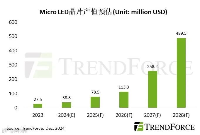 根据TrendForce集邦咨询的预测,2024年Micro LED芯片产值预估将达3880万美元左右,主要贡献来源仍是大型显示器。到2025年,预计Micro LED芯片产值达到约7850万美元,同比增长约102%。