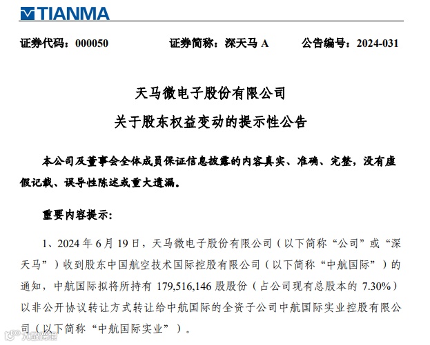 公告显示,深天马于2024年6月20日披露了《关于股东权益变动的提示性公告》、《简式权益变动报告书(中航国际)》和《简式权益变动报告书(中航国际实业)》,2024年6月19日,中国航空技术国际控股有限公司(以下简称“中航国际”)与中航国际的全资子公司中航国际实业控股有限公司(以下简称“中航国际实业”)签署了《中国航空技术国际控股有限公司与中航国际实业控股有限公司关于天马微电子股份有限公司之股份转让协议》,中航国际实业根据股权转让协议受让中航国际直接持有公司的179,516,146股股份(占公司总股本的7.30%),本次股权转让的受让方中航国际实业受本次转让方中航国际控制,且均为国有股东,此次交易采用协议转让方式。