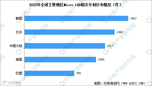 当前,Micro LED技术研发创新较活跃的区域主要集中在韩国、日本、中国大陆、美国和欧盟。其中,韩国以1567件排在第一,占23.2%;其次是日本1360件,占20.1%;中国大陆1217件,占18%;美国1080件,占16%;欧盟750件,占11%。专利权主体主要包括LG Innotek、三星电子、日本半导体能源实验室、三星显示、京东方等。