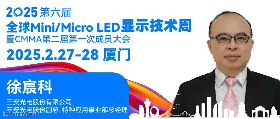 由中国电子视像行业协会指导,中国电子视像行业协会Mini/Micro LED显示产业分会(CMMA)主办,天马微电子股份有限公司联合主办,中国电子视像行业协会智能显示车联网分会、Micro LED生态联盟、厦门大学、厦门市未来显示技术研究院协办的2025年第六届全球Mini/Micro LED显示技术周暨CMMA第二届第一次成员大会将在2025年2月27-28日在厦门召开,以“MLED赋能人车家商业全场景”为主题,携全产业链企业及行业精英人士共同聚焦MLED产业链迭代发展与应用场景扩大趋势。