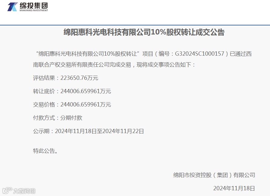 11月18日,绵阳市投资控股(集团)有限公司(简称绵投控股)发布公告称,“绵阳惠科光电科技有限公司(以下简称绵阳惠科)10%股权转让”项目(编号:G32024SC1000157)已通过西南联合产权交易所有限责任公司完成交易。交易价格为24.4亿元。