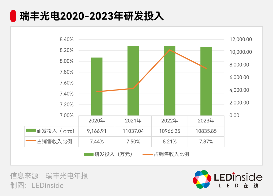瑞丰光电一贯注重研究与创新,舍得在研发方面进行投入。2020-2023年,公司的研发投入分别为9,166.91万元、11037.04万元、10966.25万元和10835.85万元,占当年销售收入的比例分别为7.44%、7.50%、8.21%和7.87%。