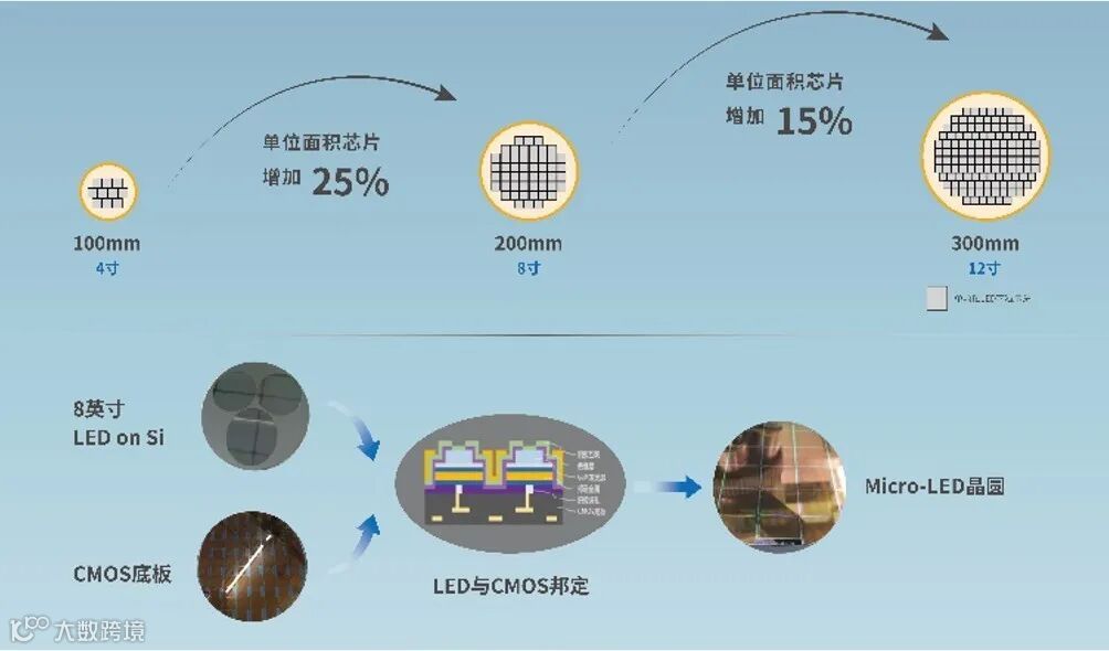 大尺寸硅衬底GaN 基Micro-LED的主要应用场景是和CMOS底板直接键合的高PPI投影、辅助/虚拟现实设备的近眼显示,它是基于8英寸及以上的GaN-on-Si晶圆和CMOS底板、并借鉴成熟的IC工艺,优势在于大尺寸、低成本、高波长一致性、无损去除、低翘曲、CMOS兼容性等等,可以有效提高制程效率和良率,降低制造成本。