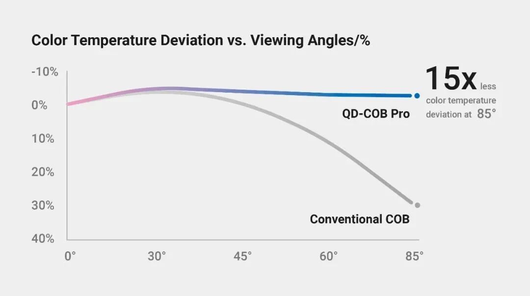 QD-COB Pro在原有QD-COB技术基础上,实现了更领先的色彩表现。产品采用波长浮动小于±0.2nm的第三代R系列量子点芯片,整屏色差值ΔE<=2,真正做到全屏色点与亮度表现均稳定如一。通过结合光形高度匹配的蓝绿芯片,这款产品实现了三色光型接近完全朗伯体一致,确保全角度观看时色坐标偏差Cx,Cy <±0.003。此外,量子点可精准调控光波长的特性进一步优化了红光色点表现,使QD-COB Pro产品的整屏色域覆盖达到≥DCI-P3的93% 。以上几个特点确保了无论观众站在屏幕的哪个角度,都能看到色彩准确的高还原画面。