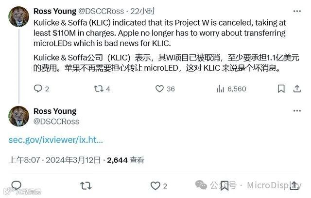 罗斯・杨在推文中认为,这个“W 项目”就是苹果的 Micro LED Apple Watch Ultra 项目。文件显示由于客户取消该项目,预计将产生高达 1.1 亿美元的费用。