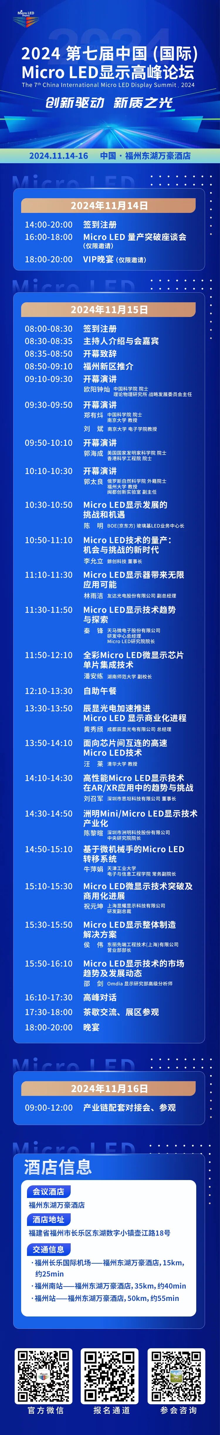 面对机遇和挑战,2024第七届中国(国际)Micro LED显示高峰论坛将于2024年11月14日至16日在福州东湖万豪酒店召开,本次论坛以“创新驱动 新质之光”为主题,通过探讨Micro LED量产突破和降本增效,洞悉最新前沿技术和应用场景,助力产业高质量发展。