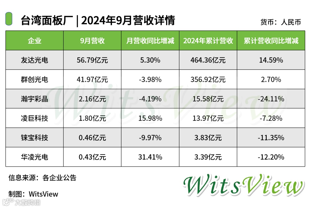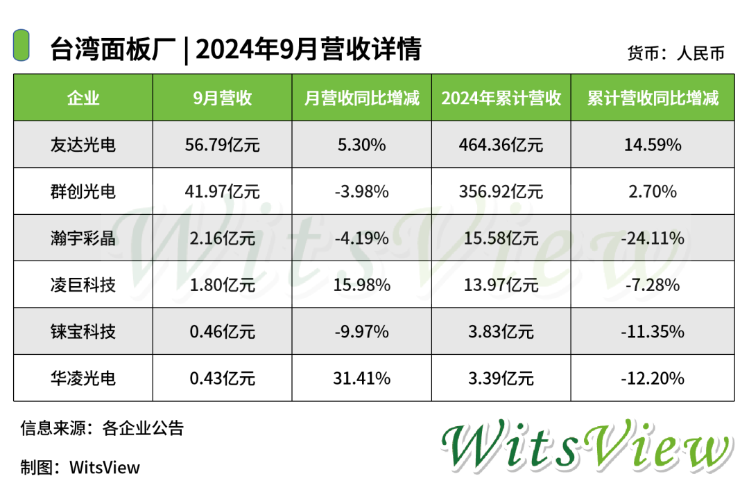日前,包括友达、群创在内的6家台湾面板厂商相继公布企业9月营收,具体情况如下: