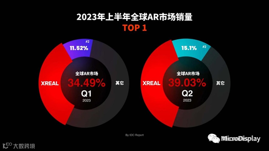 根据市场调研机构IDC数据:2022年,XREAL全球总销量为9.8万台,位居全球AR眼镜行业出货量第一;2023上半年,XREAL持续领跑全球AR市场,销量继续排名第一,其中Q1销量份额为34.49%,Q2份额上升至39.03%。