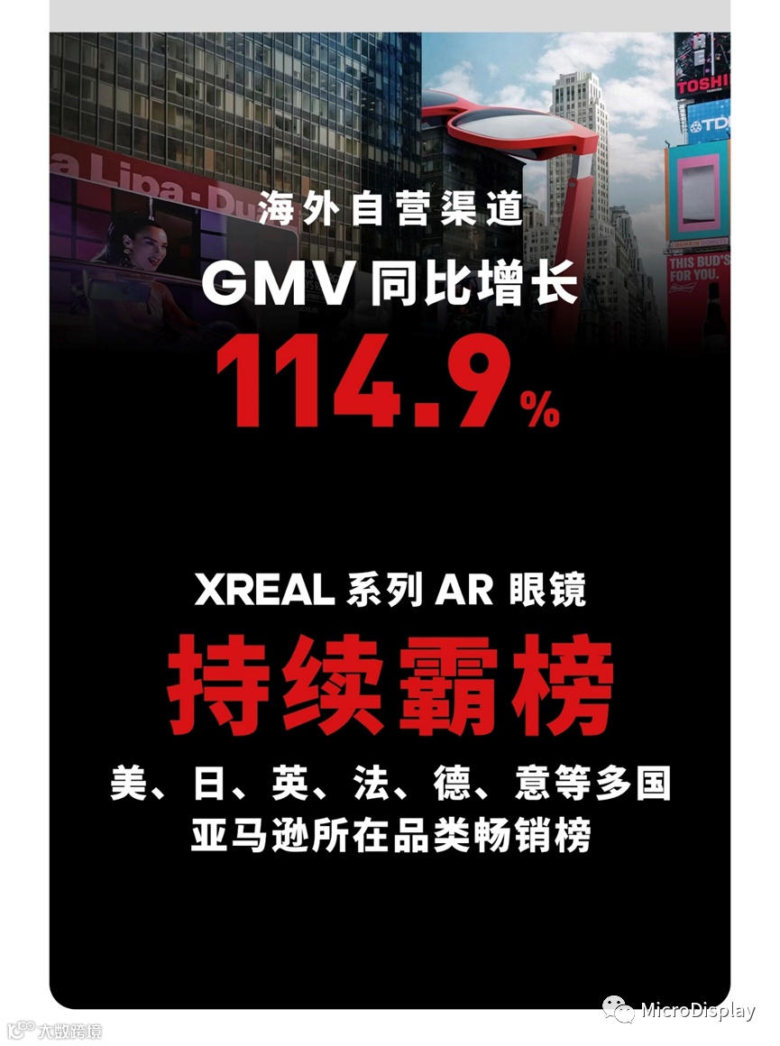 与此同时,XREAL产品的热销势头也蔓延到了海外多个国家。继10月25日Air 2系列正式登陆海外市场后,在双11期间,海外自营渠道GMV实现114.9%的同比增长,并持续霸榜美国、日本、英国、法国、德国、意大利等多国的亚马逊品类畅销榜。
